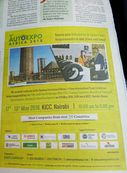 By Standard digital reporter Nairobi, Kenya: The three-day automobile extravaganza – AUTO EXPO AFRICA – KENYA 2016 - which is being organized jointly by Expo group and Expo link Exhibitions & Publications Limited (Kenya) will be held at Dome from 10 - 12 June. Auto enthusiasts and potential buyers will get an opportunity to witness the Auto Aftermarket as well as view vehicles on display. Neville Trindade, Exhibition Manager of Expogroup, had this to say, "This time around the experience is going to be unique for participants, and auto enthusiasts. For the first time, we will be providing an area for spare parts display.