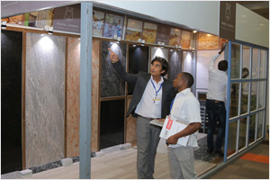 A representative of Roopsi Exports, India attending visitors at the BuildExpo 2016.Roopsi is displaying Granite Slabs, Tiles and Kitchen tops. The company is the leader in procuring and producing exclusive range of world class granite and marble primarily for exports to US, European, gulf and African Markets with potential to cater to other parts of the world.